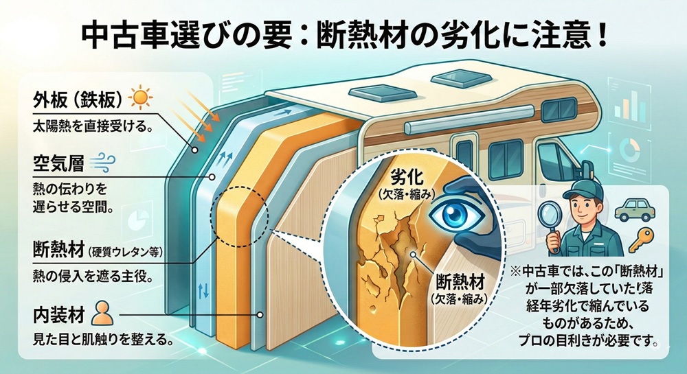 チェックのコツは、窓の構造を見ることです。2026年の中古市場でも、アクリル製の「二重窓」を採用している車両は、断熱への意識が高い優良個体である可能性が高いと言えます。また、カトモータースが提唱する「雪国断熱」のように、天井・壁・床の三面すべてに素材が詰まっているかを、家具の隙間からライトを当てて確認してください。