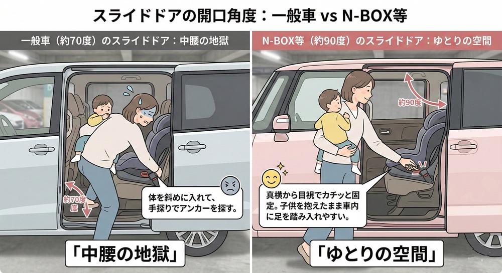 N-BOXとスズキ・スペーシアの比較調査によれば、N-BOXはドアが完全に直角(90度)まで開くため、真横から体重をかけてISOFIXコネクターをアンカーに押し込むことができます。この「わずか数度の差」が、雨の日の設置作業を5分から30秒へと短縮させるのです。