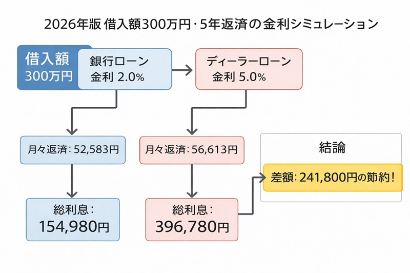 【図解:2026年版 借入額300万円・5年返済の金利シミュレーション】