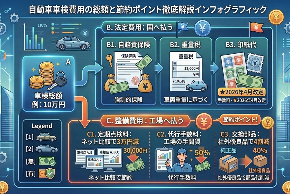【図解:2026年 車検費用の削減ポイント】